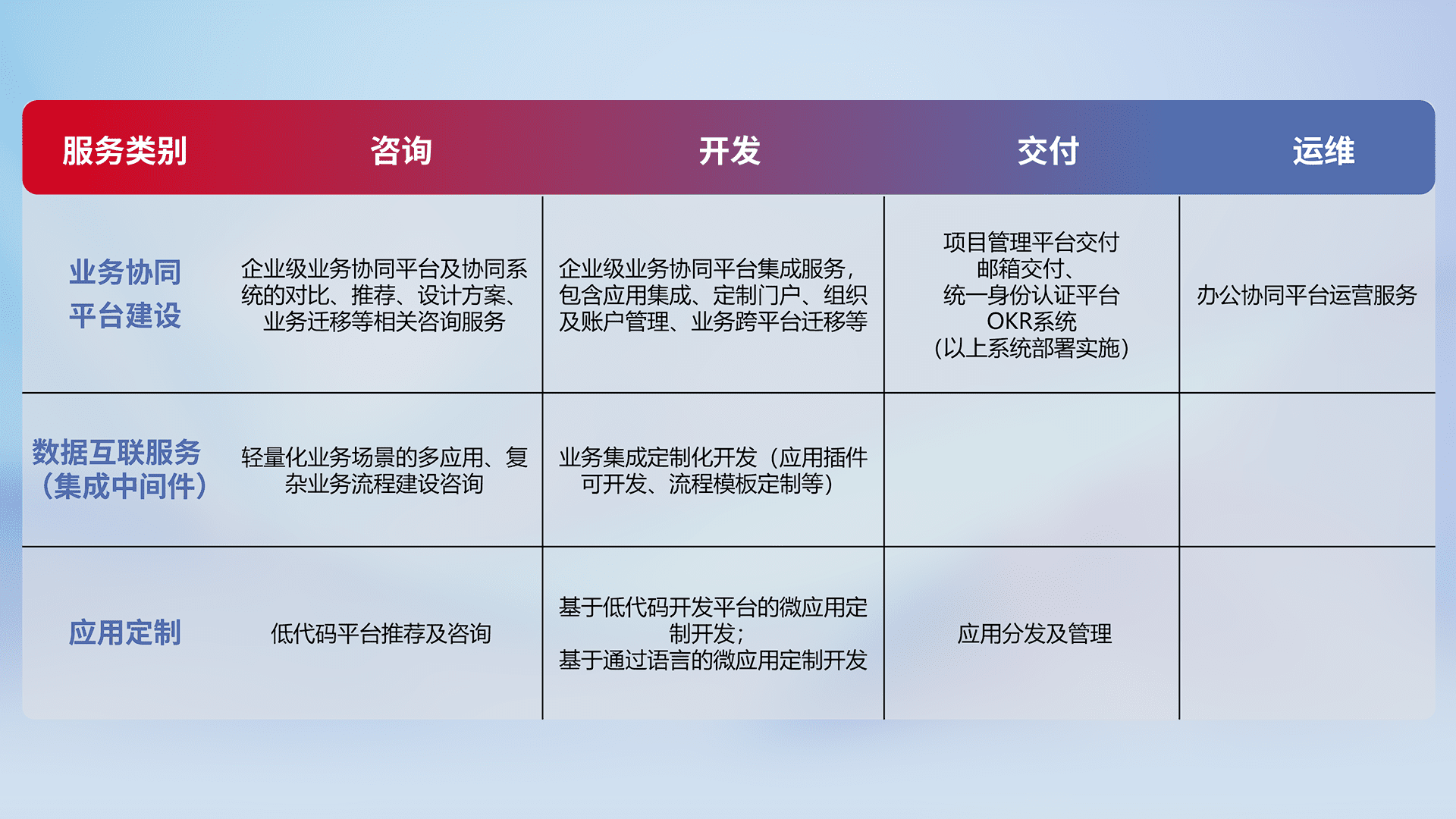 针对钉钉、、企微、、、、IDaas等平台级产品提供产品的规划、、方案、、交付、、、、定制化开发等服务,,,,实现如统一协同办公、、、智能客户服务、、混合会议管理、、智能数据查询、、、、等业务场景,,,实现数字化转型。。